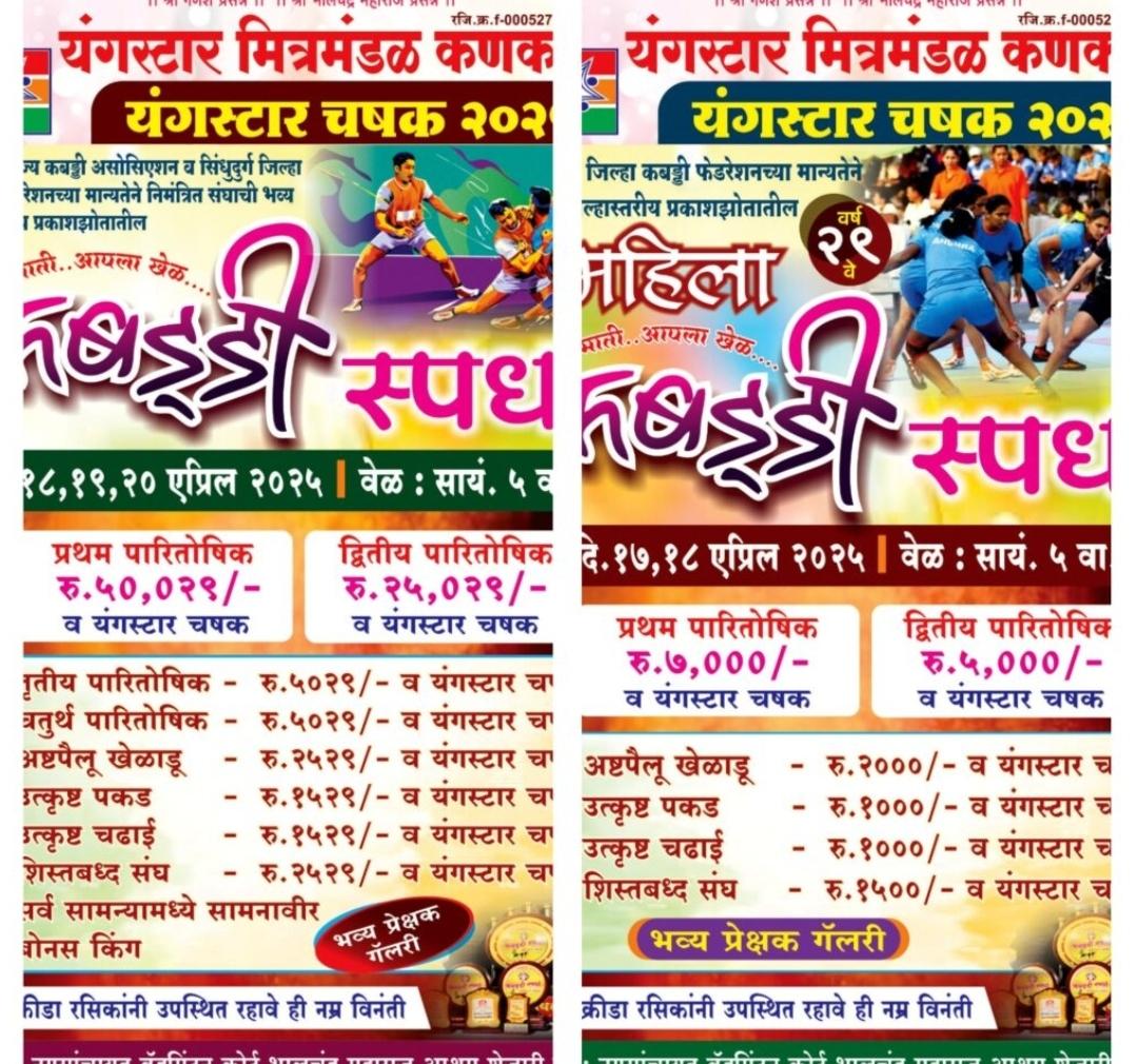 यंगस्टार मित्रमंडळ कणकवली च्या वतीने यंगस्टार चषक 2025 कबड्डी स्पर्धेचे आयोजन करण्यात आले आहे. महाराष्ट्र राज्य कबड्डी असोसिएशन व सिंधुदुर्ग जिल्हा कबड्डी फेडरेशनच्या मान्यतेने निमंत्रित संघाची राज्यस्तरीय प्रकाश झोतातील कबड्डी स्पर्धा 18, 19, 20 एप्रिल रोजी सायंकाळी पाच वाजल्यानंतर आयोजित करण्यात आली आहे. या स्पर्धेचे प्रथम पारितोषिक 50 हजार 29, द्वितीय पारितोषिक 25 हजार 29 व प्रत्येकी यंगस्टार चषक, तृतीय पारितोषिक 5 हजार 29, चतुर्थ पारितोषिक 5 हजार 29, अष्टपैलू खेळाडू, 2 हजार 529, उत्कृष्ट पकड 1हजार 529, उत्कृष्ट चढाई 1हजार 529, शिस्तबद्ध संघ २ हजार ५२९ व प्रत्येकी यंग स्टार चषक, सर्व सामन्यांमध्ये सामनावीर व बोनस किंग अशी बक्षिसे दिली जाणार आहेत. तसेच यंगस्टार चषक ची महिला कबड्डी स्पर्धा देखील 17, 18 एप्रिल रोजी सायंकाळी पाच वाजल्यानंतर होणार आहेत. या स्पर्धेसाठी प्रथम पारितोषिक 7 हजार, द्वितीय पारितोषिक 5 हजार व प्रत्येकी यंगस्टार चषक तसेच अष्टपैलू खेळाडू, उत्कृष्ट पकड, उत्कृष्ट चढाई, शिस्तभंग संघला प्रत्येकी यंग स्टार चषक देण्यात येणार आहे. भालचंद्र महाराज आश्रमा शेजारी कणकवली नगरपंचायत च्या स्पोर्ट कॉम्प्लेक्स मध्ये या स्पर्धा होणार आहेत. क्रीडा रसिकांनी या दोन्ही स्पर्धेचा लाभ घ्यावा असे आवाहन यंगस्टार मित्र मंडळ कणकवली च्या वतीने करण्यात आले आहे.