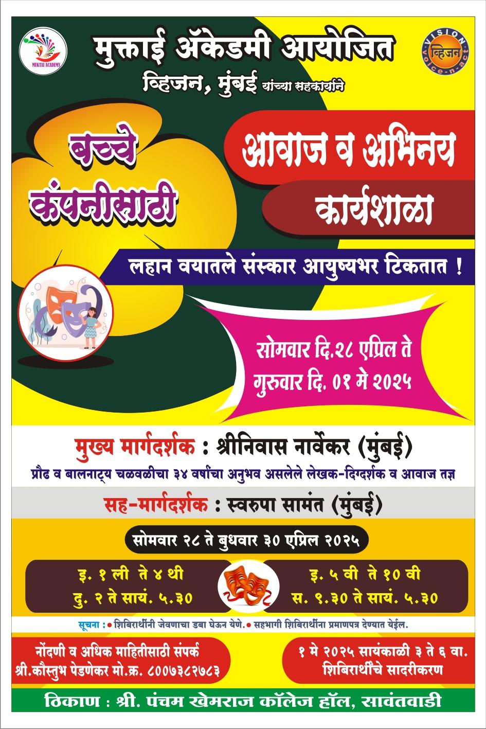 इयत्ता पाचवी ते दहावीतील विदयार्थ्यांसाठी सोमवार 28 ते बुधवार 30 एप्रिल रोजी सकाळी 9:30 ते सायंकाळी 5:30 आणि पहिली ते चौथीतील विदयार्थ्यांसाठी सोमवार 28 ते बुधवार 30 एप्रिल रोजी दुपारी 2 ते सायंकाळी 5:30 या वेळेत आवाज, संवाद कौशल्य आणि अभिनय याविषयी मार्गदर्शन करण्यात येईल.गुरुवार 1 मे रोजी दुपारी 3 ते सायंकाळी 6 या वेळेत सर्वांसाठी मुलांच्या कलागुणांचे सादरीकरण करण्यात येईल.”या पुढे मुलांसाठी बालनाट्य, गायन आणि संगीत विषयक कार्यक्रम घेणार असल्याचे”, मुक्ताई ॲकेडमीचे अध्यक्ष श्री.कौस्तुभ पेडणेकर यांनी सांगितले.या कार्यशाळेत नोंदणीसाठी व अधिक माहितीसाठी श्री.कौस्तुभ पेडणेकर मो.क्र.8007382783 यांच्याशी संपर्क करावयाचा आहे.