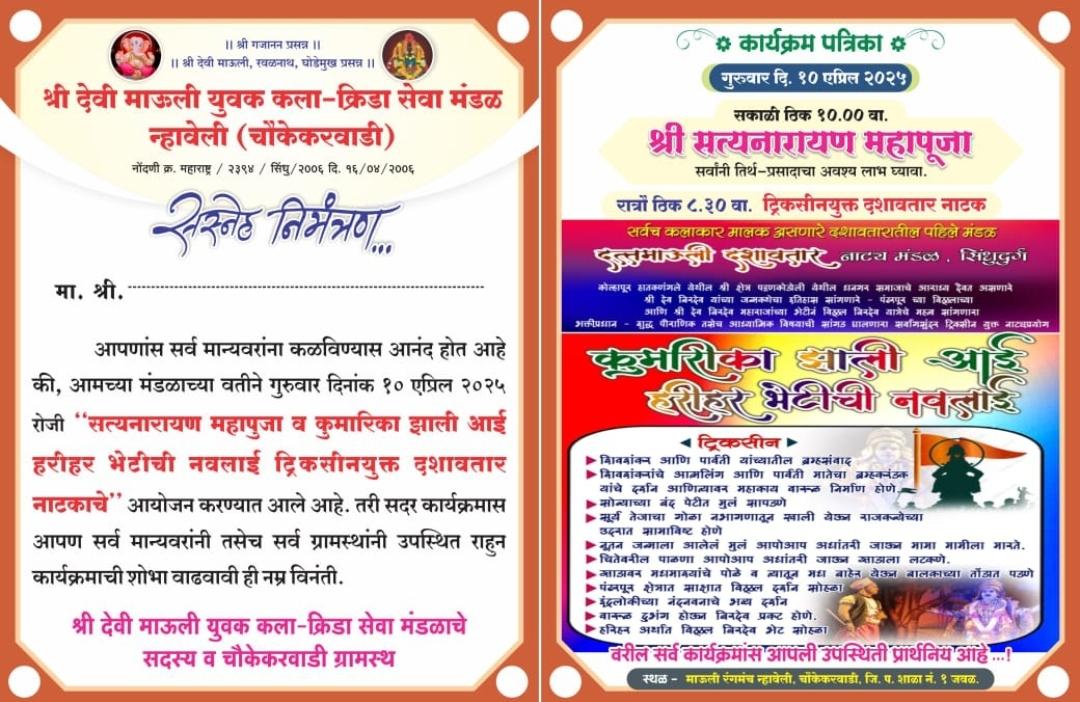 गुरुवार दिनांक *१०एप्रिल २०२५* रोजी _श्री देवी माऊली युवक कला क्रीडा सेवा मंडळ न्हावेली_ आयोजित *सत्यनारायण महापूजा* , संध्या.६:००वा. भजन आणि रात्री *८:००वा.दत्तमाऊली दशावतार नाट्य मंडळ सिंधुदुर्ग* चे ट्रिकसीनयुक्त नाटक *कुमारीका झाली आई हरीहर भेटीची नवलाई ~_विठ्ठल बिरदेव भेट*~ . _स्थळ- माऊली रंगमंच न्हावेली चौकेकरवाडी_ करण्यात आले आहे.
