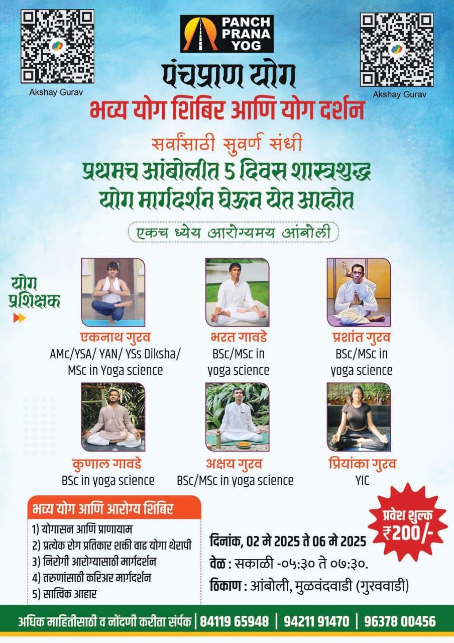 सावंतवाडी तालुक्यातील आंबोलीत प्रथमच ५ दिवसांच्या योग शिबिराचे आयोजन करण्यात आले आहे. या सुवर्णसंधीचा लाभ घेऊन शास्त्रशुद्ध योग मार्गदर्शन घेऊन इच्छुक नागरिकांनी, दि. २ मे २०२५ ते ०६ मे २०२५ वेळ सकाळी ६:०० ते ८:०० या कालावधीत आंबोली, मुळवंदवाडी (गुरववाडी) उपस्थित राहण्याचे आवाहन आयोजकांकडून करण्यात आले आहे.
