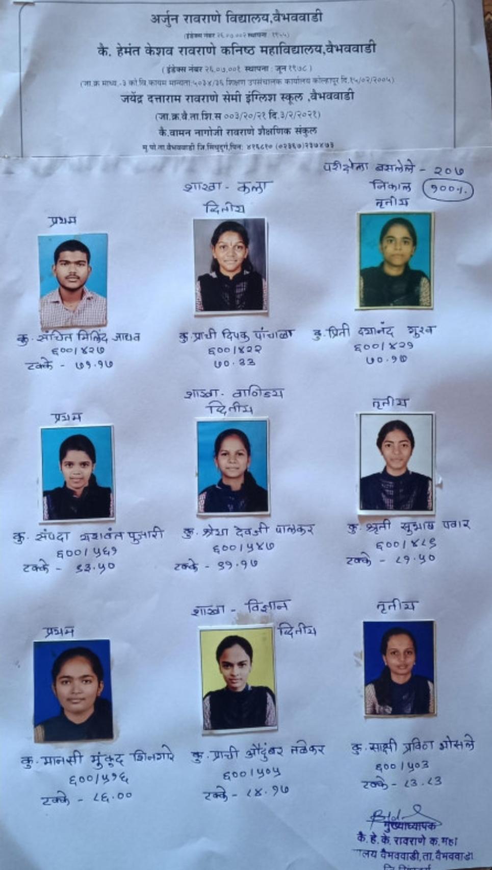 तसेच वाणिज्य शाखेतून प्रथम क्रमांक – समीक्षा अनंत चंदुरकर ८०. ६७ टक्के, द्वितीय क्रमांक तनिष्क अमित खानविलकर ७७. १७टक्के, तृतीय क्रमांक – सिद्धी वासुदेव झोरे ७४.८३ टक्के, सर्व गुणवंत विद्यार्थ्यांचे तालुक्यात सर्वत्र अभिनंदन करण्यात येत आहे.