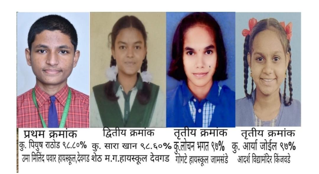 प्रथम सारा जावेद खान(९८.६०), द्वितीय आर्या संतोष कणेरकर(९५.२०), तृतीय निशाद निळकंठ मराठे(९४.६०), चतुर्थ सन्मयी सचिन नाचणकर(९४.४०), पाचवी सई सचिन बेर्डे(९४.२०)