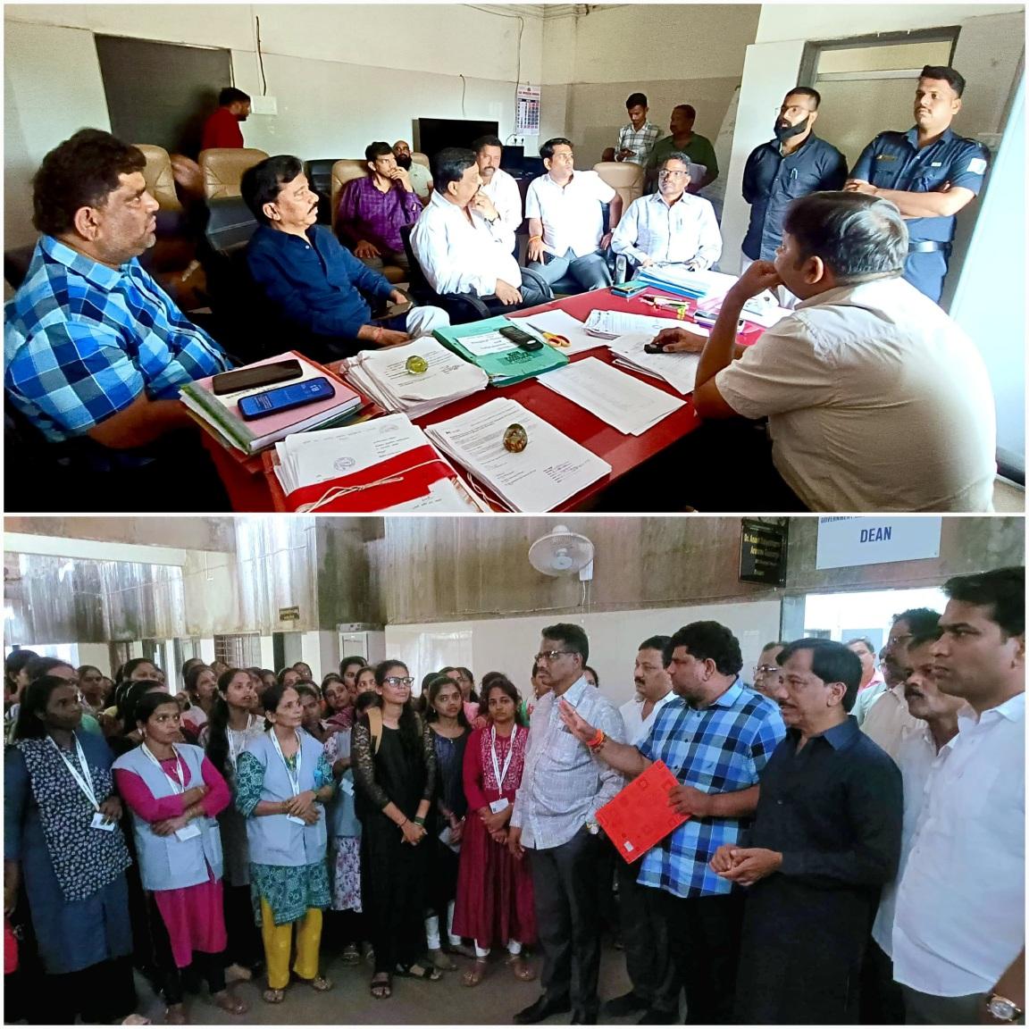 सिंधुदुर्ग शासकीय वैद्यकीय महाविद्यालयात ठेकेदारामार्फत कंत्राटी पद्धतीने तांत्रिक व शिपाई, सफाई कामगार (वर्ग ‘क’ आणि वर्ग ‘ड’) ची २३० पदे भरण्यात आलेली आहेत. मात्र भरती केलेले कर्मचारी राजकीय पक्षाचे कार्यकर्ते असल्याचे आढळून येत असून हे कर्मचारी आपल्या कामाच्या ठिकाणी उपस्थित नसतात प्रत्यक्षात हजेरी पाहिली असता १५० कर्मचारी कामावर हजर असतात. मात्र महिन्याला ५७ लाख रुपये ठेकेदाराला पगार पडतो परंतु प्रत्यक्षात कामावर असलेल्या कर्मचाऱ्यांना मात्र तुटपुंजा पगार दिला जातो.त्यामुळे ठेकेदारामार्फत कर्मचाऱ्यांच्या पगाराचे पैसे काढण्यासाठीच आणि भ्रष्टाचार करण्यासाठीच हि बोगस कंत्राटी कर्मचारी भरती करण्यात आली आहे का असा सवाल करत माजी आमदार वैभव नाईक, माजी आमदार परशुराम उपरकर, माजी आमदार राजन तेली, कणकवली विधानसभा प्रमुख सतीश सावंत, युवासेना जिल्हाप्रमुख सुशांत नाईक यांनी वैद्यकीय महाविद्यालयाचे अधिष्ठाता अनंत दवंगे यांना धारेवर धरले. असुविधांबाबत जाब विचारला.