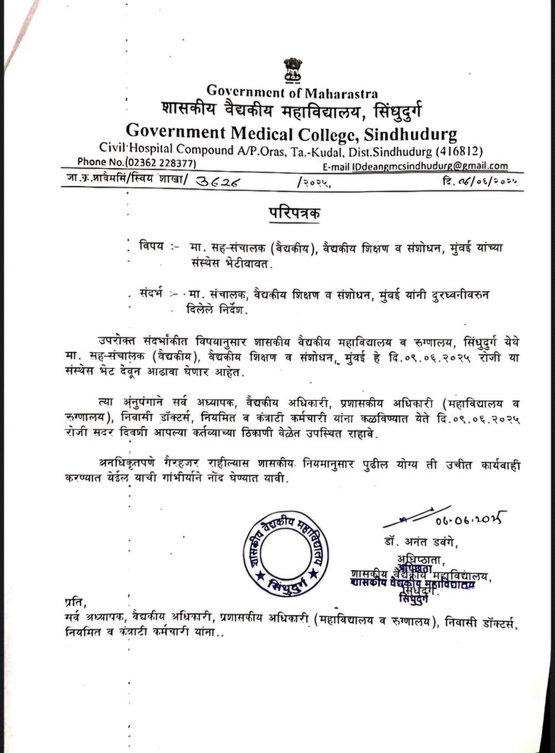 शिवसेना उद्धव बाळासाहेब ठाकरे पक्षाच्या शिष्टमंडळाने सिंधुदुर्ग शासकीय वैद्यकीय महाविद्यालयात बुधवारी धडक देत कंत्राटी कमर्चाऱ्यांच्या पगाराच्या पैशात केला जाणारा भ्रष्टचार उघडकीस आणला होता. त्याचबरोबर २० जून पर्यंत आयुक्तांसोबत बैठक लावा अन्यथा २१ जून रोजी ठिय्या आंदोलन छेडू असा इशारा वैद्यकीय महाविद्यालयाचे अधिष्ठाता अनंत डवंगे यांना दिला होता याची दखल घेऊन वैद्यकीय शिक्षण व संशोधन मुंबईचे सहसंचालक हे ०९ जून २०२५ रोजी सिंधुदुर्ग शासकीय वैद्यकीय महाविद्यालयात भेट देऊन आढावा घेणार आहेत. याबाबतचे परिपत्रक अधिष्ठाता डॉ. अनंत डवंगे यांनी काढले आहे. सर्व अध्यापक, वैद्यकीय अधिकारी,प्रशासकीय अधिकारी (महाविद्यालय व रुग्णालय) निवासी डॉक्टर, नियमित व कंत्राटी कमर्चारी यांनी ०९ जून रोजी आपल्या कर्तव्याच्या ठिकाणी वेळेत उपस्थित रहावे. अनधिकृत पणे गैरहजर राहिल्यास शासकीय नियमानुसार कारवाई करण्यात येईल असे आदेश अधिष्ठाता डॉ. अनंत डवंगे यांनी परिपत्रकाद्वारे दिले आहेत.