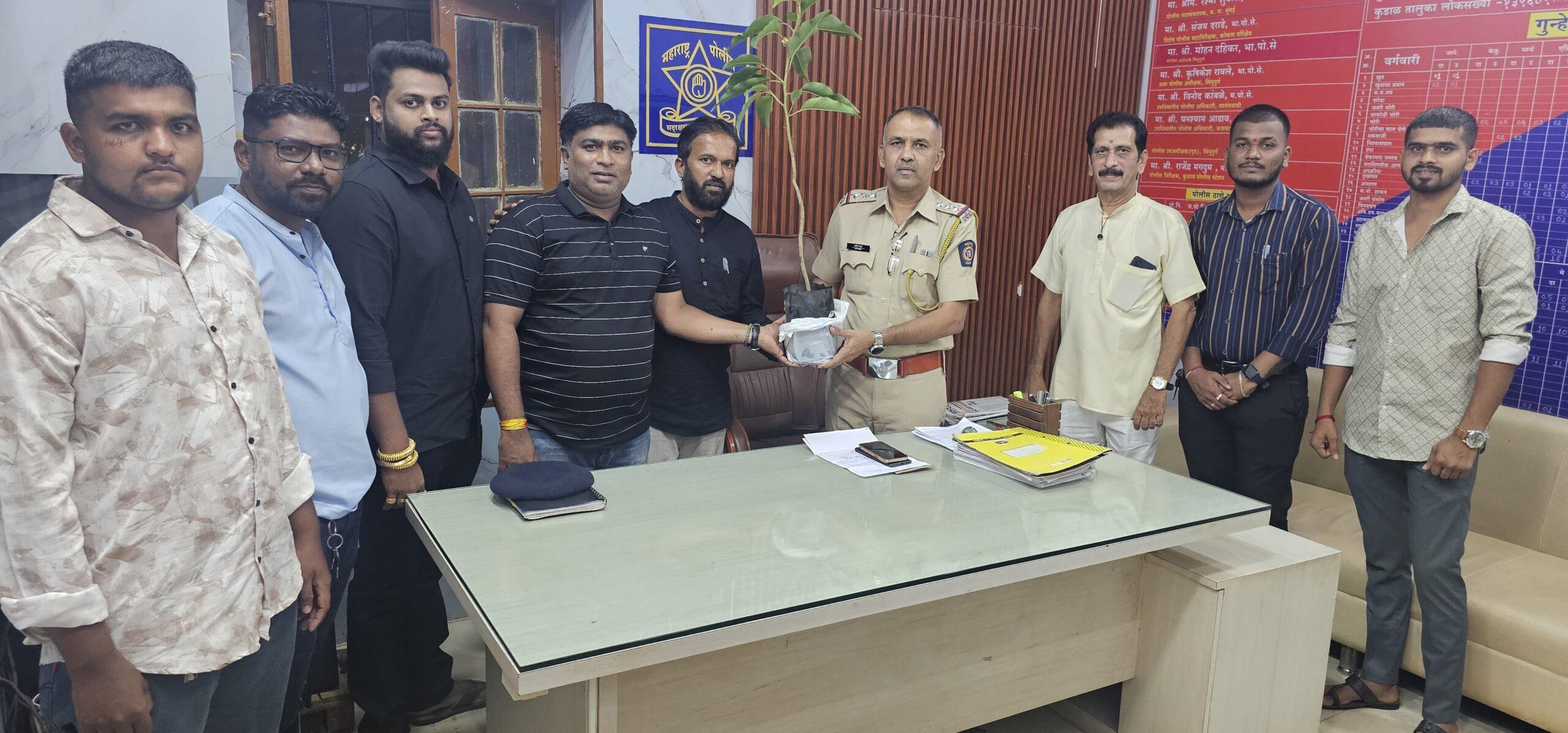 नुकत्याच कुडाळ तालुक्यातील विविध ठिकाणच्या सात घरफोड्या, दरोडे ,चोरी करणाऱ्या आरोपीस जेरबंद व बिडवलकर खुन प्रकरणात योग्य तपास करणाऱ्या कुडाळ पोलीस निरीक्षक श्री. मगदूम व सह कर्मचाऱ्यांचे जिल्हाध्यक्ष धीरज परब यांच्या नेतृत्वाखाली मनसे कडुन अभिनंदन करण्यात आले. याप्रसंगी त्यांना सुगंधी चाफा फुलाचे वृक्ष देऊन सन्मानित करण्यात आले.