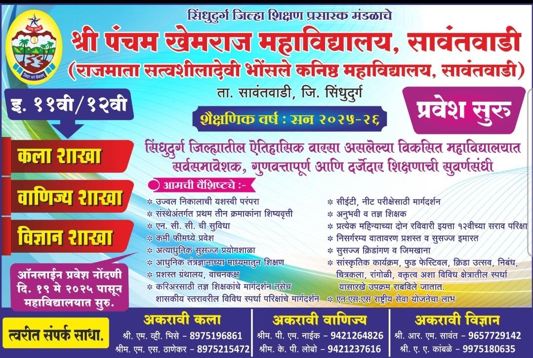 मुंबई विद्यापीठ संलग्न व सिंधुदुर्ग जिल्हा शिक्षण प्रसारक मंडळ संचलित श्री पंचम खेमराज महाविद्यालय सावंतवाडी येथे शैक्षणिक वर्ष 2025-2026 साठी कला ,वाणिज्य व विज्ञान विभागामध्ये प्रवेश प्रक्रिया चालू आहे.