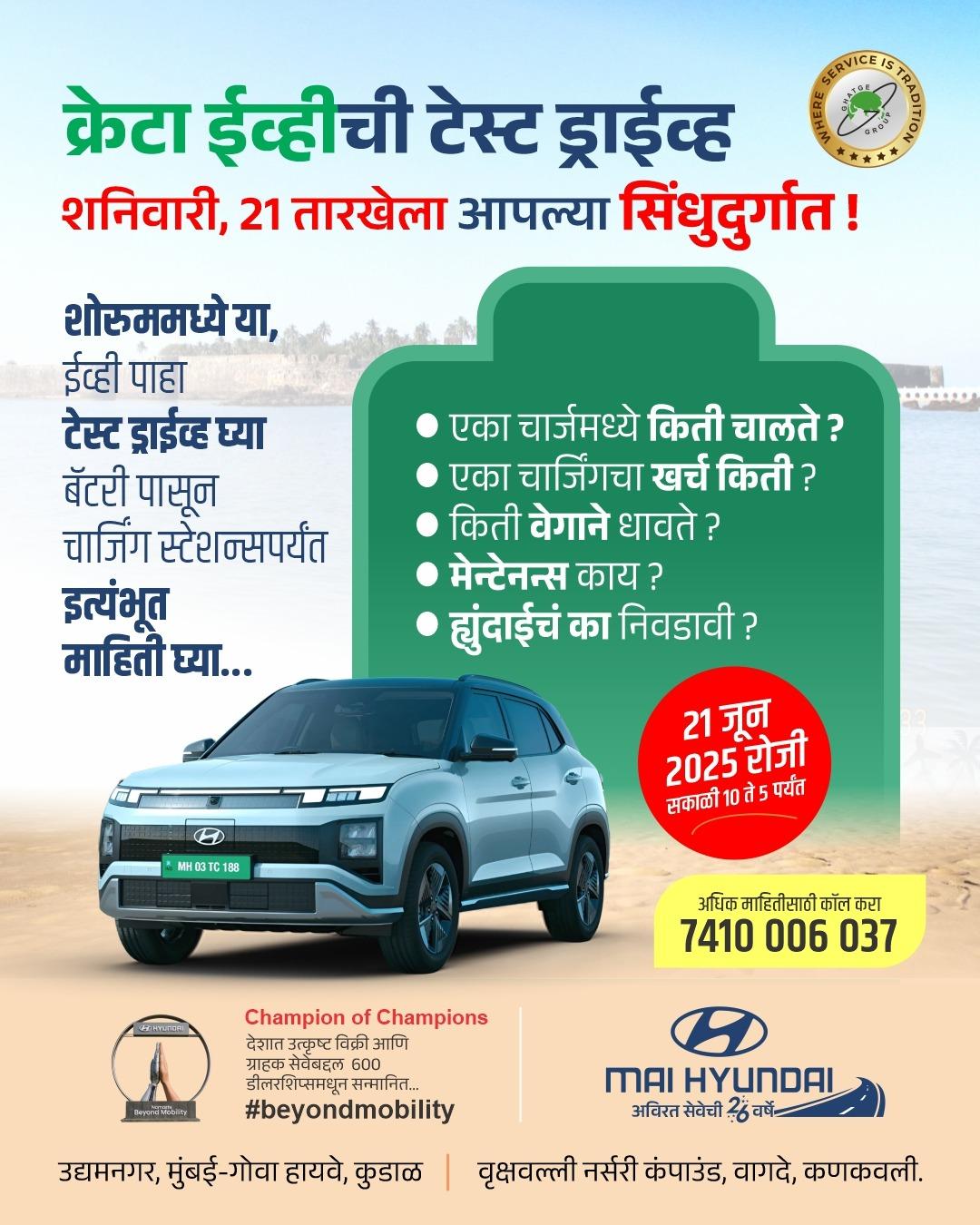 *क्रेटा ईव्हीची टेस्ट ड्राईव्ह शनिवारी, 21 तारखेला आपल्या सिंधुदुर्गात !*