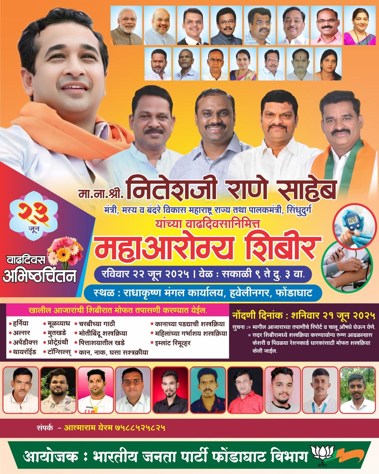 पालकमंत्री नितेश राणे यांच्या वाढदिवसानिमीत्त फोंडाघाट मध्ये महा आरोग्य शिबीराचे आयोजन