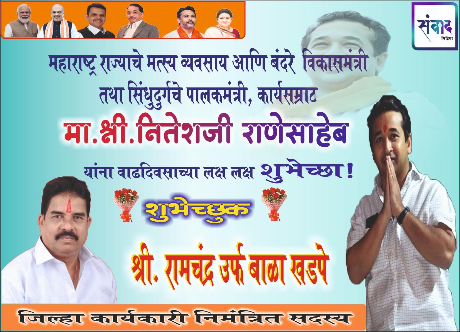महाराष्ट्र राज्याचे मत्स्य व्यवसाय आणि बंदरे विकासमंत्री तथा सिंधुदुर्गचे पालकमंत्री, कार्यसम्राट मा. श्री नितेशजी राणे साहेब यांना वाढदिवसाच्या लक्ष लक्ष शुभेच्छा !💐