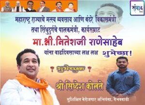 महाराष्ट्र राज्याचे मत्स्य व्यवसाय आणि बंदरे विकासमंत्री तथा सिंधुदुर्गचे पालकमंत्री, कार्यसम्राट मा. श्री नितेशजी राणे साहेब यांना वाढदिवसाच्या लक्ष लक्ष शुभेच्छा !💐