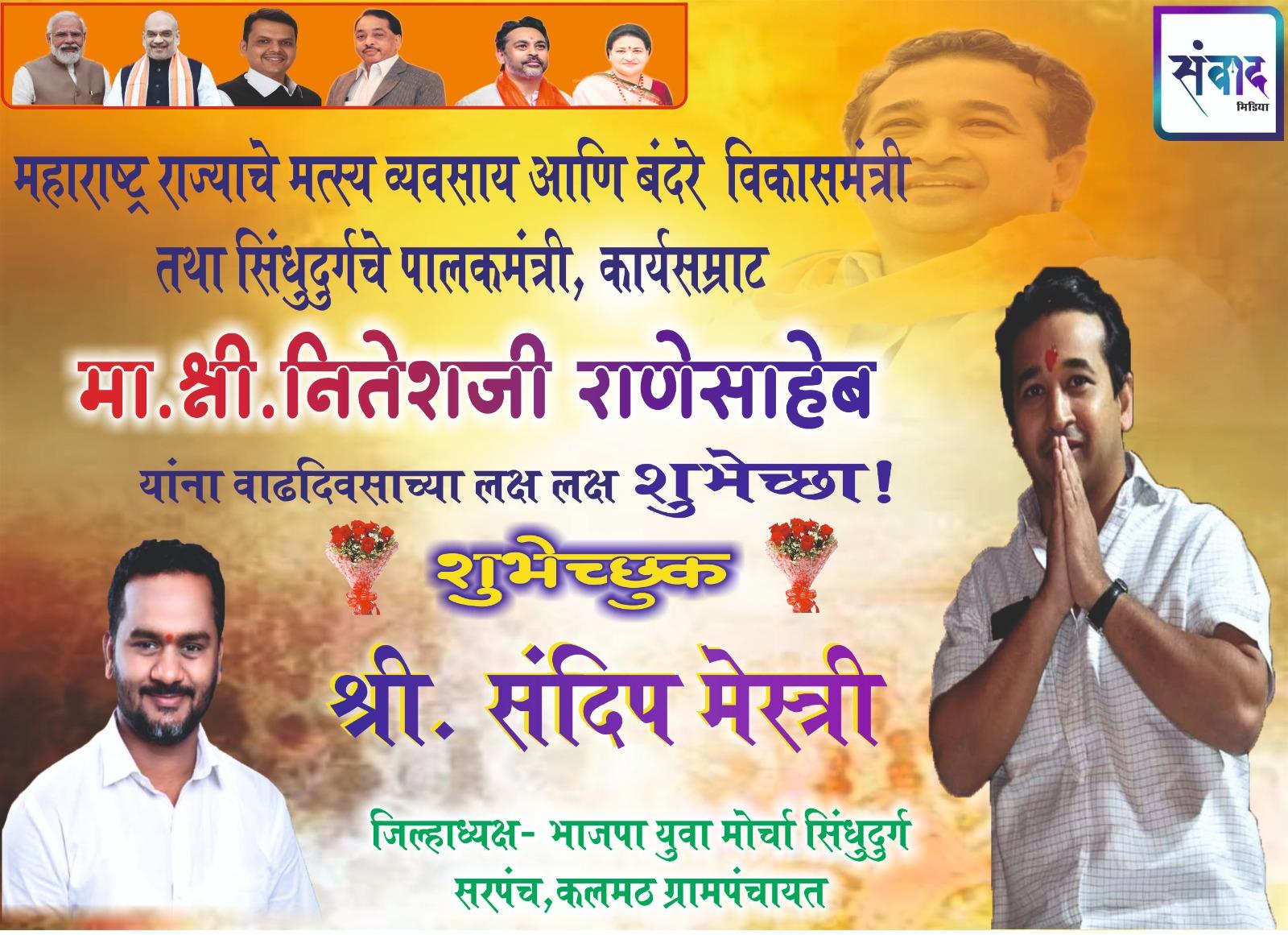 महाराष्ट्र राज्याचे मत्स्य व्यवसाय आणि बंदरे विकासमंत्री तथा सिंधुदुर्गचे पालकमंत्री, कार्यसम्राट मा. श्री नितेशजी राणे साहेब यांना वाढदिवसाच्या लक्ष लक्ष शुभेच्छा !💐