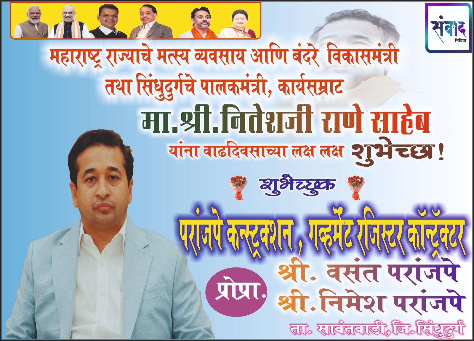 महाराष्ट्र राज्याचे मत्स्य व्यवसाय आणि बंदरे विकासमंत्री तथा सिंधुदुर्गचे पालकमंत्री, कार्यसम्राट मा. श्री नितेशजी राणे साहेब यांना वाढदिवसाच्या लक्ष लक्ष शुभेच्छा !💐