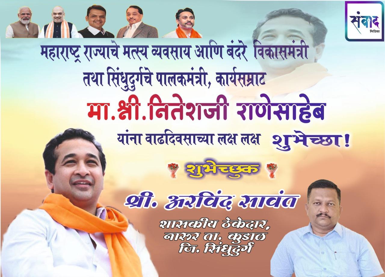 महाराष्ट्र राज्याचे मत्स्य व्यवसाय आणि बंदरे विकासमंत्री तथा सिंधुदुर्गचे पालकमंत्री, कार्यसम्राट मा. श्री नितेशजी राणे साहेब यांना वाढदिवसाच्या लक्ष लक्ष शुभेच्छा !💐