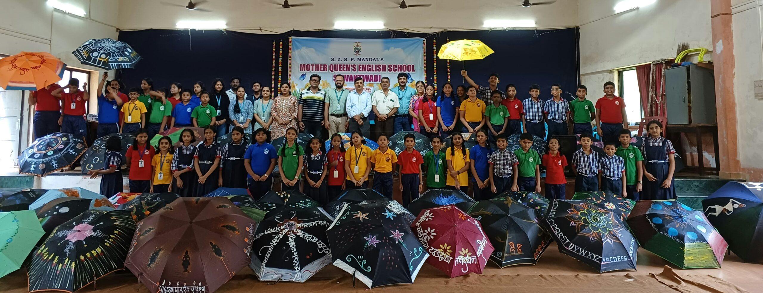 सिंधुदुर्ग जिल्हा शिक्षण प्रसारक मंडळ संचलित मदर क्वीन्स इंग्लिश स्कूल सावंतवाडी मध्ये शनिवार दिनांक 28 जून 2025 रोजीअम्ब्रेला पेंटिंग ऍक्टिव्हिटी आयोजित करण्यात आली .कार्यक्रमाचे उद्घाटन दीप प्रज्वलनाने व मान्यवरांच्या स्वागताने झाले. सदर उपक्रमामध्ये इयत्ता पाचवी ते नववीची मुले सहभागी झाली होती. फॅब्रिक कलर्सचा वापर करून प्लेन छत्रीवर कॅलिग्राफी आर्ट आकर्षक पद्धतीने साकारण्यात आली. यात पावसाची बडबड गीते, घोषवाक्य, सुंदर विचार ,निसर्ग चित्रे रेखाटण्यात आली. तसेच सहभागी विद्यार्थ्यांनी मुक्त हस्ताने रंगांच्या छटा पसरवून रंगबिरंगी नक्षीकाम सुंदररीत्या साकारले .त्याचप्रमाणे वेगवेगळ्या पानाफुलांच्या नक्षीकामाने, निसर्गातील विविध आकारांच्या चित्रांनी तसेच शालेय विषयासंदर्भातील बोधचिन्हे देखील कुंचल्याने रेखाटून छत्र्यांचे सुशोभीकरण करण्यात आले. या उपक्रमामुळे विद्यार्थ्यांच्या कल्पकतेला वाव मिळाल्याने सर्व मुलांना अप्रतिम कलाविष्काराचा अनुभव आनंदाने घेता आला.यावेळी सहभागी विद्यार्थ्यांना बी.एस. बांदेकर फाईन आर्ट कॉलेजचे प्राचार्य श्री उदय वेळे, प्रोफेसर तुकाराम मोरजकर, प्रोफेसर आत्माराम शिरोडकर ,प्रोफेसर सिद्धेश नेरुरकर या कला तज्ञांनी मार्गदर्शन केले तसेच फाईन आर्ट कॉलेजचे विद्यार्थी लखन पाटील, ऋतुजा कानडे ,स्वरांगी रानडे, मृदुला ठाकूर ,ऋतुजा सुतार , विष्णुप्रसाद सावंत यांनी देखील मुलांना मार्गदर्शन केले. यावेळी सिंधुदुर्ग जिल्हा शिक्षण प्रसारक मंडळाचे अध्यक्ष डॉ. सतीश सावंत, श्री. जयप्रकाश सावंत, प्रशालेच्या मुख्याध्यापिका सौ.अनुजा साळगावकर तसेच शिक्षक व शिक्षकेतर कर्मचारी उपस्थित होते. सदर उपक्रम यशस्वी होण्यासाठी कलाशिक्षक श्री.कुलदीप कालवणकर ,सहाय्यक शिक्षिका श्रीम.अस्मिता परब यांनी विशेष मेहनत घेतली. कार्यक्रमाचे सूत्रसंचालन श्रीम. अमिना शेख यांनी केले