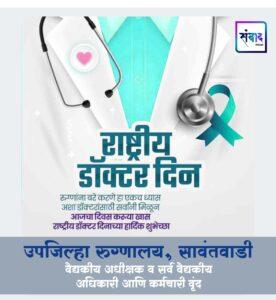 डॉक्टर्स डे’ च्या सर्वांना हार्दिक शुभेच्छा ! – उपजिल्हा रुग्णालय, सावंतवाडी Post published:जुलै 1, 2025 Post category:आरोग्य / इतर / विशेष / सावंतवाडी / सिंधुदुर्ग Post comments:0 Comments डॉक्टर्स डे’ च्या सर्वांना हार्दिक शुभेच्छा !🩺🎗️ उपजिल्हा रुग्णालय, सावंतवाडी वैद्यकीय अधीक्षक, सर्व वैद्यकीय अधिकारी आणि कर्मचारी वृंद Share this: Click to share on WhatsApp (Opens in new window) WhatsApp Click to share on Facebook (Opens in new window) Facebook Click to share on X (Opens in new window) X Click to share on LinkedIn (Opens in new window) LinkedIn Click to print (Opens in new window) Print You Might Also Like युवा नेते विशाल परब यांनी तळवडे येथे साधला संवाद मे 4, 2024 आ. वैभव नाईक यांची सिंधुदुर्ग किल्ल्यावरील शिवराजेश्वर मंदिराच्या नूतनीकरणाची व मालवण शासकीय विश्रामगृहाच्या कामाची पाहणी नोव्हेंबर 3, 2023 “साईकृपा संस्था” शासकीय पुरस्काराने सन्मानित.. ऑगस्ट 15, 2024 शिवभवानी कला व क्रीड़ा मंडळाच्या वतीने दूध वाटपाचा कार्यक्रम. ऑक्टोबर 27, 2023 प्रतिक्रिया व्यक्त करा उत्तर रद्द करा.CommentEnter your name or username to comment Enter your email address to comment Enter your website URL (optional) Notify me of follow-up comments by email. Notify me of new posts by email. Δ