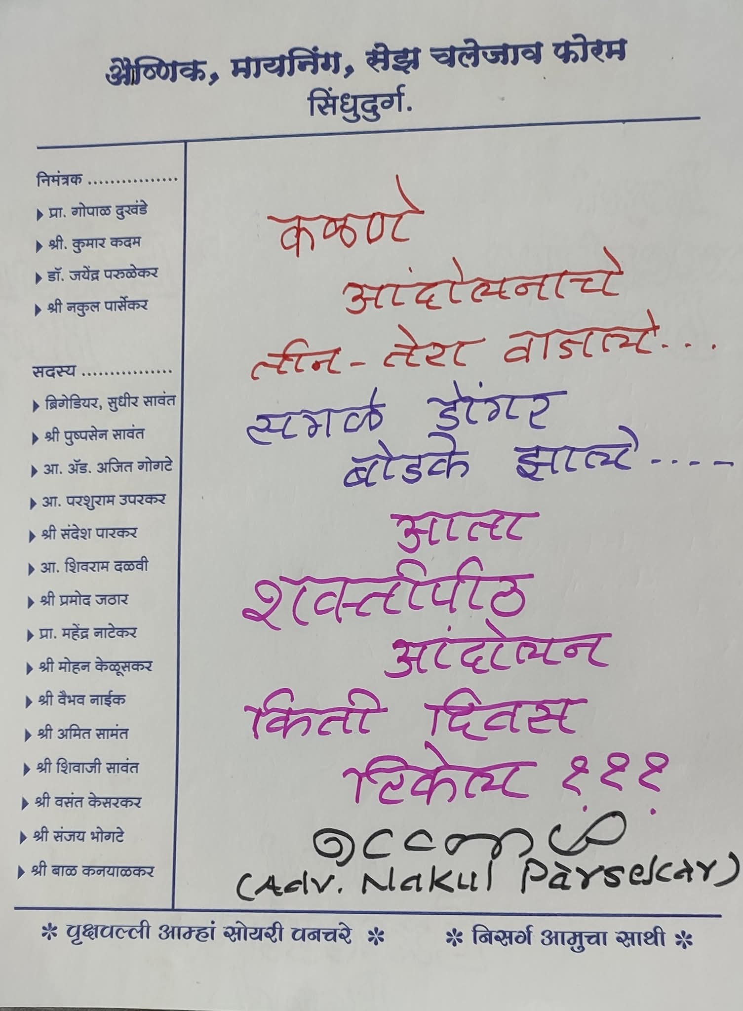 आता सिंधुदुर्गात हा शक्तीपीठ विरोधी लढा सुरू होईल. आंदोलन होतील. महायुती सरकारकडे पाशवी बहुमत आहे. सत्तेच्या जोरावर आंदोलन चिरडून टाकले जाईल आणि आमच्या दुर्दैवाने पुन्हा एकदा कळण्याची पुनरावृत्ती होईल. आपण आशा करुया की या आंदोलनात स्वच्छ हेतू ठेवून पर्यावरणाच्या संवर्धनासाठी हा लढा एका योग्य मार्गाने लढला जाईल, त्यासाठी शुभेच्छा!