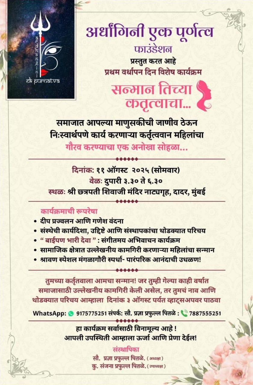 मुंबई (गुरुदत्त वाकदेकर) : *सर्वांचे घर असावे, सर्वा मुखी असावा घास, राहू नये कधी कुणी उपाशी हा एकाच वसा हा एकाच ध्यास…* समाजात माणुसकीची जाणीव ठेवत, निःस्वार्थ भावनेने कार्य करणाऱ्या कर्तृत्ववान महिलांचा गौरव करण्यासाठी ‘अर्धांगिनी एक पूर्णत्व फाउंडेशन’ तर्फे त्यांच्या प्रथम वर्धापन दिना निमित्त एक आगळावेगळा सन्मान सोहळा आयोजित करण्यात आला आहे. ‘सन्मान तिच्या कर्तृत्वाचा’ या विशेष कार्यक्रमाचे आयोजन ११ ऑगस्ट २०२५, सोमवार रोजी दुपारी ३.३० ते ६.३० या वेळेत श्री छत्रपती शिवाजी मंदिर नाट्यगृह, दादर, मुंबई येथे होणार आहे.