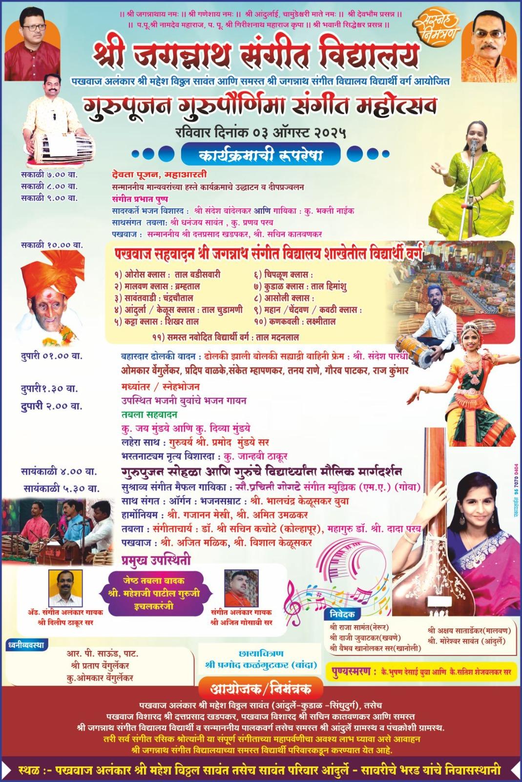 श्री जगन्नाथ संगीत विद्यालय, पखवाज अलंकार श्री महेश विठ्ठल सावंत आणि विद्यालयातील समस्त विद्यार्थ्यांच्या संयुक्त विद्यमाने गुरुपौर्णिमा संगीत महोत्सवाचे आयोजन करण्यात आले आहे. हा भव्य कार्यक्रम रविवार, दिनांक ०३ ऑगस्ट २०२५ रोजी आयोजित करण्यात आला असून संगीतप्रेमींसाठी ही एक अविस्मरणीय पर्वणी ठरणार आहे.