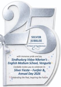 सिंधुदुर्ग विद्या निकेतन इंग्लिश मीडियम स्कूल, वेंगुर्ला यांच्या स्थापनेला २५ वर्षे पूर्ण होत असून या रौप्य महोत्सवानिमित्त फनफेअर व वार्षिक स्नेहसंमेलन २०२६ चे भव्य आयोजन करण्यात आले आहे. “२५ वर्षांच्या एकत्रित वाटचालीचा उत्सव” या संकल्पनेतून हा सोहळा अत्यंत अभिमान आणि आनंदाच्या वातावरणात साजरा होणार आहे.