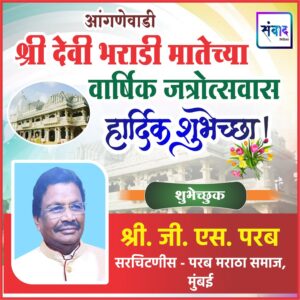 आंगणेवाडी श्री देवी भराडी मातेच्या वार्षिक जत्रोत्सवास हार्दिक शुभेच्छा ! – श्री. जी. एस. परब Post published:फेब्रुवारी 6, 2026 Post category:इतर / धार्मिक / मालवण / विशेष / सिंधुदुर्ग Post comments:0 Comments आंगणेवाडी श्री देवी भराडी मातेच्या वार्षिक जत्रोत्सवास हार्दिक शुभेच्छा ! 💐 🌺 शुभेच्छुक 🌺 श्री. जी. एस. परब सरचिटणीस – परब मराठा समाज, मुंबई Share this: Click to share on WhatsApp (Opens in new window) WhatsApp Click to share on Facebook (Opens in new window) Facebook Click to share on X (Opens in new window) X Click to share on LinkedIn (Opens in new window) LinkedIn Click to print (Opens in new window) Print You Might Also Like सोशल मीडियात मेसेज करणाऱ्या ‘त्या’ समाजकंटकांना शिक्षा व्हायलाच हवी… सप्टेंबर 28, 2024 शीर्षक: श्रावण आला… ऑगस्ट 2, 2024 सिंधुदुर्ग सैनिक स्कूल आंबोली येथे उन्हाळी सुट्टीत साहसी व व्यक्तिमत्व विकास प्रशिक्षण शिबिरे मार्च 8, 2023 जिल्ह्यात आज 144 व्यक्ती कोरोना पॉझिटिव्ह जुलै 23, 2021 प्रतिक्रिया व्यक्त करा उत्तर रद्द करा.CommentEnter your name or username to comment Enter your email address to comment Enter your website URL (optional) Notify me of follow-up comments by email. Notify me of new posts by email. Δ