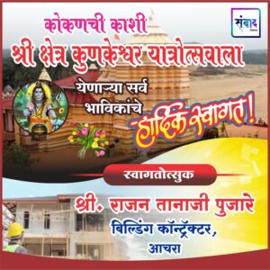 कोकणची काशी श्री क्षेत्र कुणकेश्वर यात्रोत्सवाला येणाऱ्या सर्व भाविकांचे हार्दिक स्वागत! – श्री. राजन पुजारे Post published:फेब्रुवारी 15, 2026 Post category:इतर / धार्मिक / मालवण / विशेष / सिंधुदुर्ग Post comments:0 Comments कोकणची काशी श्री क्षेत्र कुणकेश्वर यात्रोत्सवाला येणाऱ्या सर्व भाविकांचे हार्दिक स्वागत!💐 🌺 स्वागतोत्सुक 🌺 श्री. राजन तानाजी पुजारे बिल्डिंग कॉन्ट्रॅक्टर, आचरा Share this: Click to share on WhatsApp (Opens in new window) WhatsApp Click to share on Facebook (Opens in new window) Facebook Click to share on X (Opens in new window) X Click to share on LinkedIn (Opens in new window) LinkedIn Click to print (Opens in new window) Print You Might Also Like व्यापारी महासंघाचा ३६ वा मेळावा मालवणात भव्यदिव्य होणार मार्च 5, 2023 इंग्रजी माध्यम शाळेचा तो फलक अखेर उतरविला.. एप्रिल 3, 2021 न्हावेली बीएसएनएल टॉवरचे नेटवर्क बंद; ग्राहकांना आर्थिक फटका मे 18, 2024 आमदार नितेश राणे साहेब यांना वाढदिवसाच्या हार्दिक शुभेच्छा!! – श्री. आनंद लाड जून 22, 2024 प्रतिक्रिया व्यक्त करा उत्तर रद्द करा.CommentEnter your name or username to comment Enter your email address to comment Enter your website URL (optional) Notify me of follow-up comments by email. Notify me of new posts by email. Δ