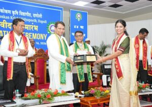 सुवर्णपदक पुरस्कार प्रदान करताना श्री. सुरेश प्रभू (माजी केंद्रीय मंत्री,भारत सरकार). पुरस्कार स्वीकारताना कु. साक्षी थोरात, डॉ. संजय भावे. (कुलगुरू डॉ. बाळासाहेब सावंत कोकण कृषी विद्यापीठ दापोली.)